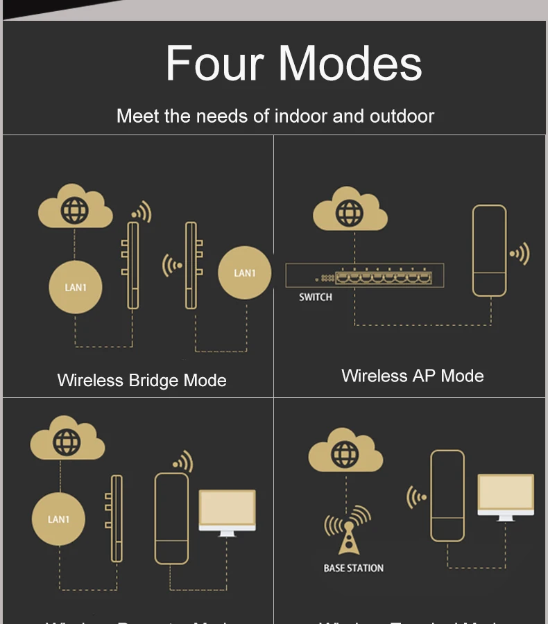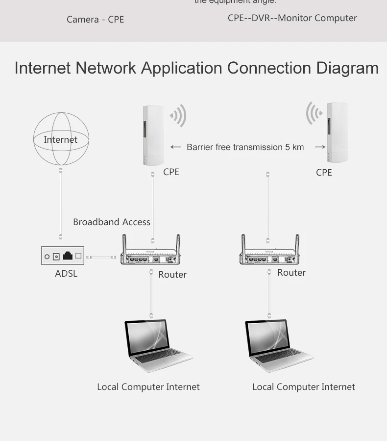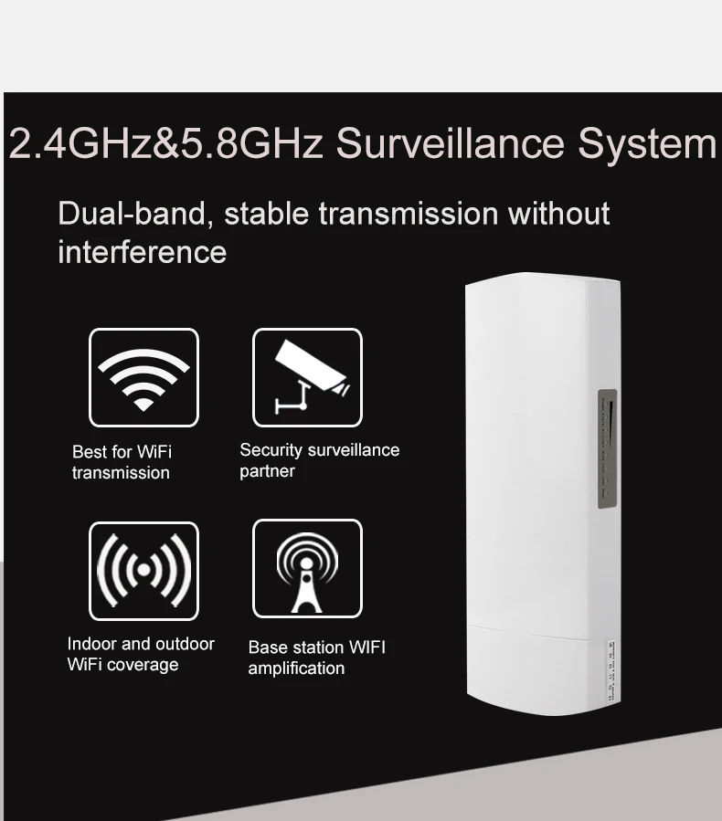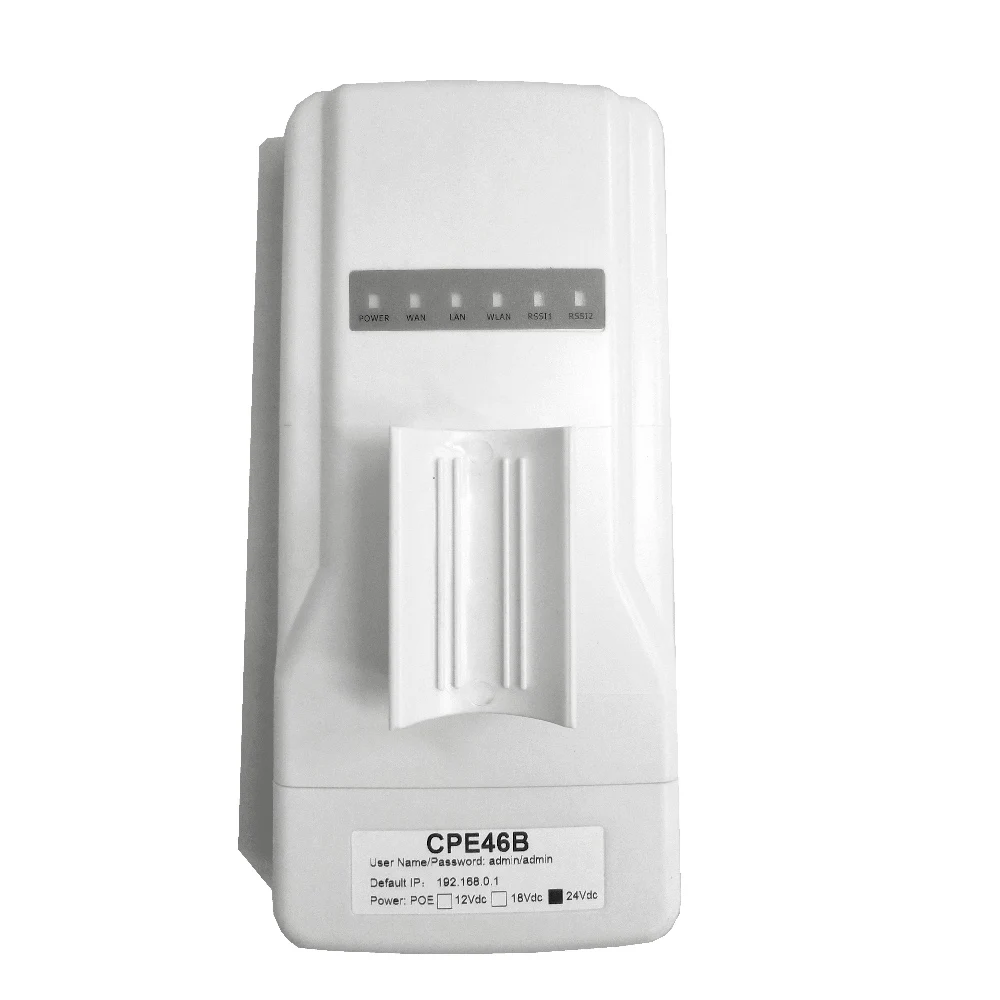 1.CPE046 wireless repeater is a high power router with 5.8b outdoor and indoor wifi bridge and 802.11b / g / n Wi-Fi standard450Mbps high speed in 5.8, equipped with two 10 / 100M LAN ports, double the Ethernet data3.Wireless repeater makes it accessible to more than 20 end users to enjoy seamless HD movies, streaming media, online games, wireless security and other bandwidth-intensive tasks.4. Data transmission to a remote point-to-point or point-to-multipoint connection. It supports 1-2KM (maximum) transmission distance, and the bidirectional traffic is up to 300M.5.CPE046 cpe router with intelligent network management function, can automatically pair.feature* 200mW high power, built-in 12dBi MIMO flat panel antenna, stronger signal strength and larger wireless coverage* Built-in firewall, IP filter, URL filter and MAC filter* Complies with IEEE 802.3az standard, beamforming technology, RF power adjustment and frequency analyzer, can be better applied to different environments* Support DDNS, VPN pass-through, port forwarding and DMZ host* Supports 64 / 128-bit WEP security, 128-bit WPA (TKIP / AES) securityChipset: AR9531Flash * DDR2: Flash 8MB * DDR2 64MBInterface: 10 / 100Mbps WAN * 1 LAN * 1Power supply: POE 24V 1AFrequency range: 2300 ~ 2800MHzPolarization direction: horizontal / verticalGain: 12DBiTelnet: supportMAC address control: supportWEP-based management: supportEncryption: WEP encryption 64/128 bit, WPA, WPA2, 802.1xWorking temperature: -30 ~ 70 ℃Storage temperature: -30 ~ 65 ℃Humidity (unconcentrated): le95%